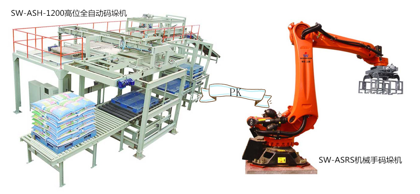機械手碼垛機眾所周知有如人手一般的裝置,棗莊三維機械手碼垛機SW-ASRS主要由壓平整理、緩沖輸送機、抓取輥道、托盤機、機械手等裝置組成。整個碼垛的過程首先由輸送機將合格的包裝袋輸送到整平機進行壓袋整平,使袋形平整,包裝袋到達抓取輥道后機械手檢測到來袋的包裝袋對其進行抓取、轉向、堆放、分層進行碼放,從而完成整個碼垛工序。而它像人手一般的機械手裝置有一個缺點,如果來袋的包裝袋袋型不夠整齊會導致抓袋時將包裝袋抓破。因為機械手結構簡單安裝方便前期投入少、可同時碼垛不同規格型號的來料成品,也滿足3條輸送線來料的碼垛需求的特點,所以上市以來倍受眾多客戶的青睞。而棗莊三維不但有機械手這個結構小巧安裝簡單的碼垛機外,還有一款不會將包裝袋抓破的全自動碼垛機SW-ASH-1200高位全自動碼垛機,顧名思義高位碼垛機安裝高度相對機械手碼垛機來說要高出許多,而且高位全自動碼垛機只能碼垛一種規格一條輸送線來料的成品碼垛需求,而且相對機械手而言前期投入成本多出接近10倍,所以客戶一般都很少關注。但是高位碼垛機碼垛速度能達到1600包/小時,垛型整齊美觀牢固,是較傳統的人工碼垛效率高,這是機械手無法比擬的,而且所有包裝袋的袋口朝里,可實現自動編組分層。而機械手一般可碼垛800包/小時,雙手的可達到1000包/小時的碼垛速度;一般的機械手碼垛機可用6-8年,而高位全自動碼垛機可使用100年,使用壽命高出12倍還多;高位碼垛機可在任何地區使用,而機械手碼垛機不能在高原地區使用,多用于北方地區;機械手碼垛機每年會產生1-3W的保養維護費,而這項費用高位碼垛機沒有,長期以往節省不少開支。
